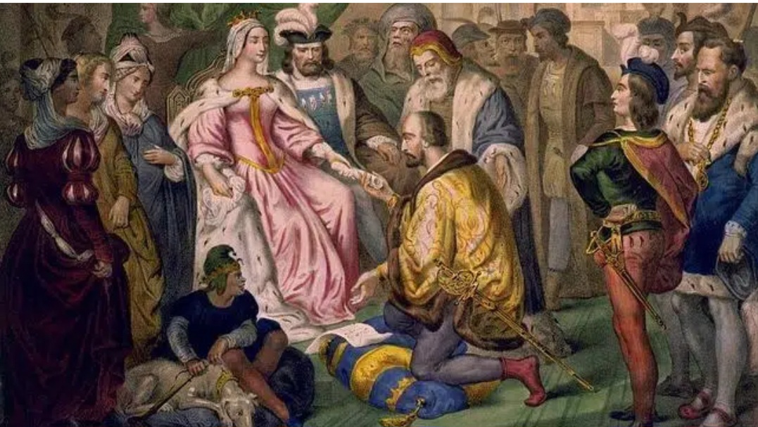 Isabel I, la Católica, recibe el tributo de Cristóbal Colón