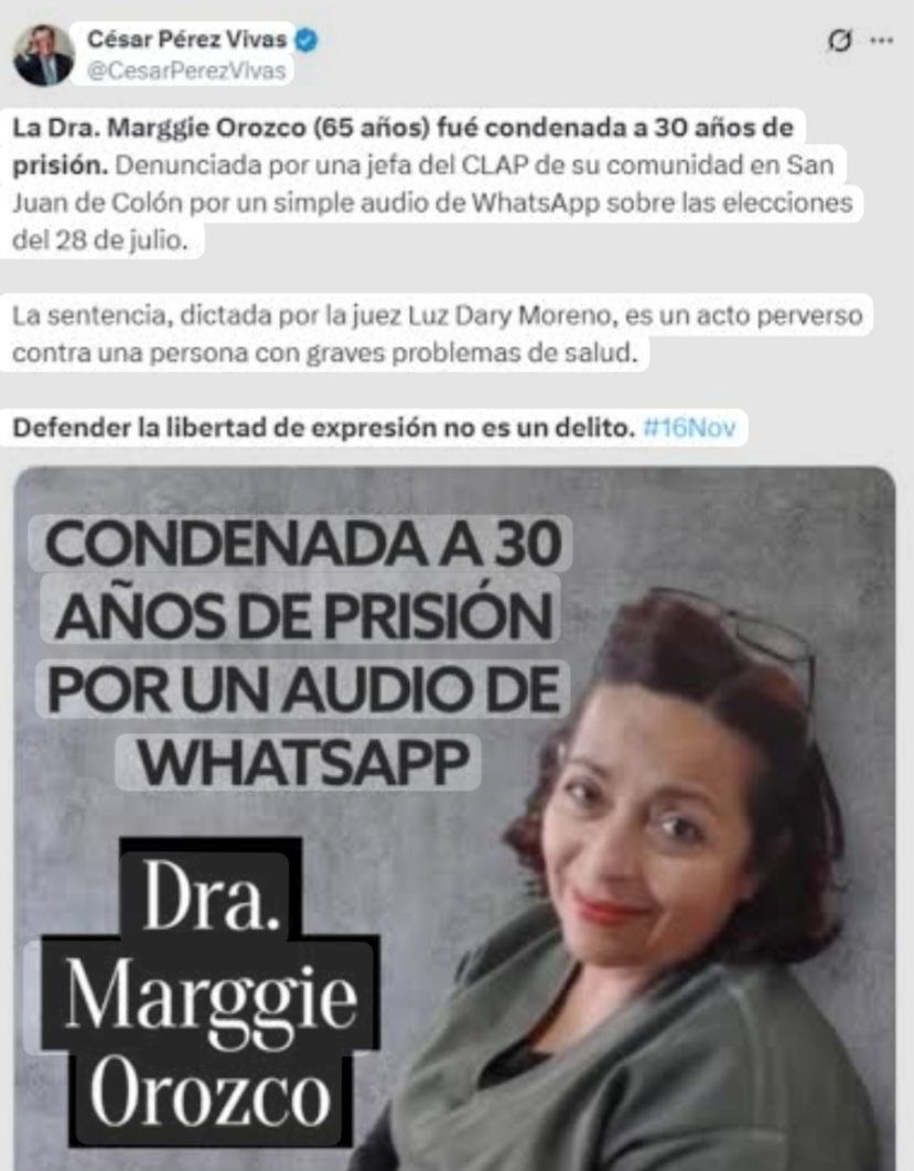 El caso de la Dra. Marggie Orozco en San Juan de Colón, estado Táchira, es un escándalo mayúsculo. Se trata de una venezolana de 65 años de edad a la que los tribunales de la dictadura condenan a 30 años de prisión. Su detención ocurrió solo por compartir un mensaje en un grupo de WhatsApp, instando a sus vecinos a participar en las elecciones presidenciales, mientras dejaba saber sus fundamentadas críticas al régimen madurista. La denuncia, según su familia y organizaciones de DDHH, fue interpuesta por una representante local del CLAP, demostrando cómo estas figuras, que deberían limitarse a la distribución de alimentos, son usadas como agentes de control social y delación política. El trato inhumano que recibió, culminando con un infarto dentro de la comisaría y su posterior traslado sin consideraciones médicas al anexo femenino del Centro Penitenciario de Occidente, evidencian la crueldad intrínseca del régimen.