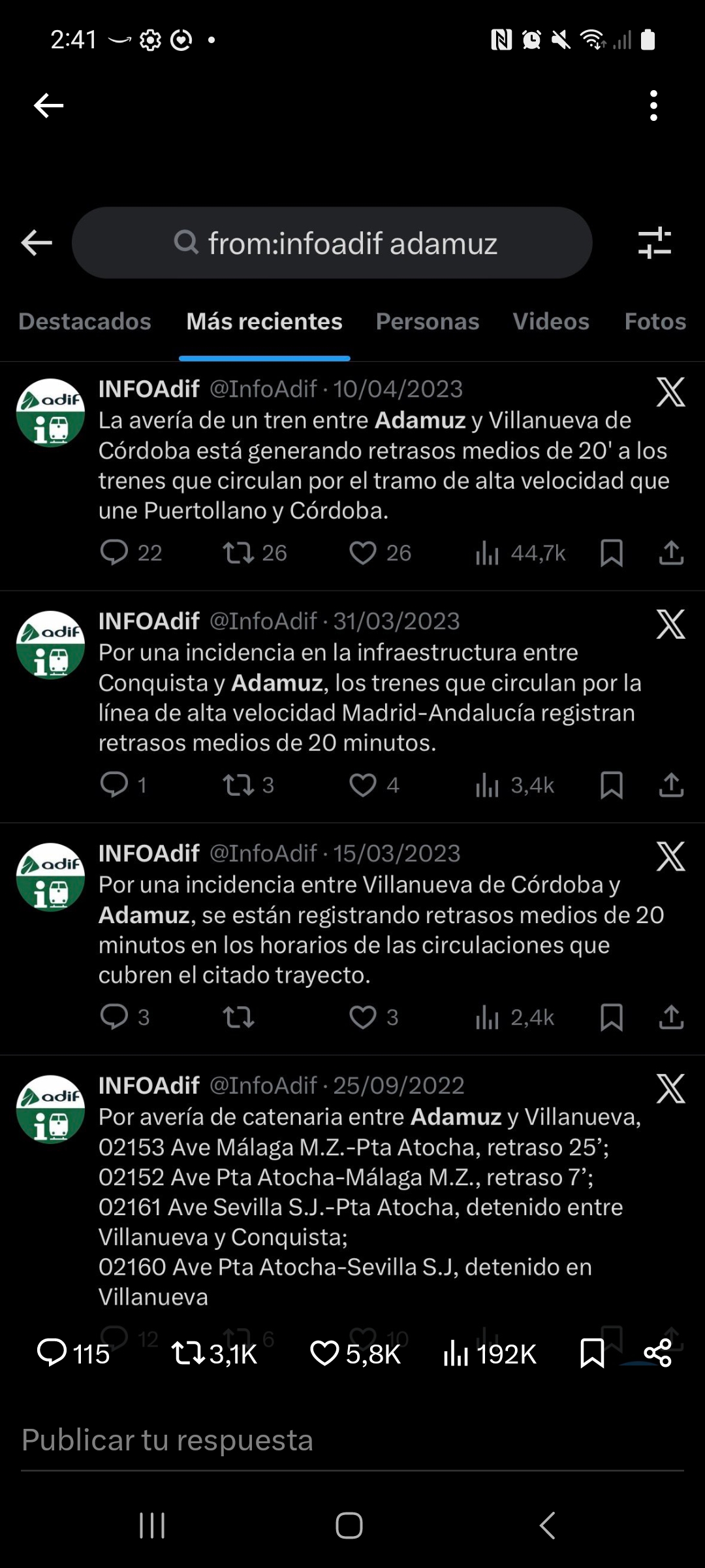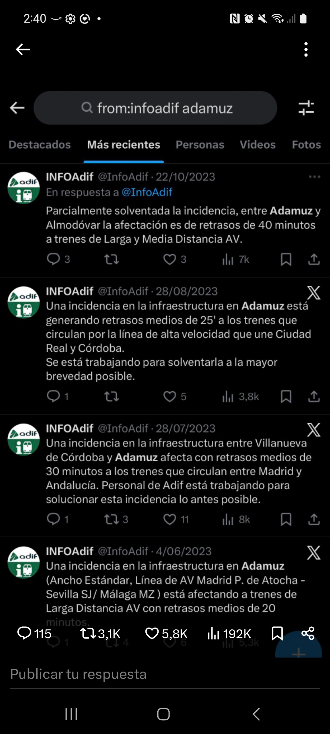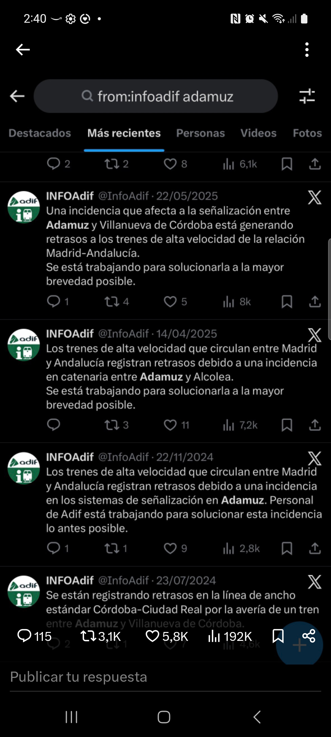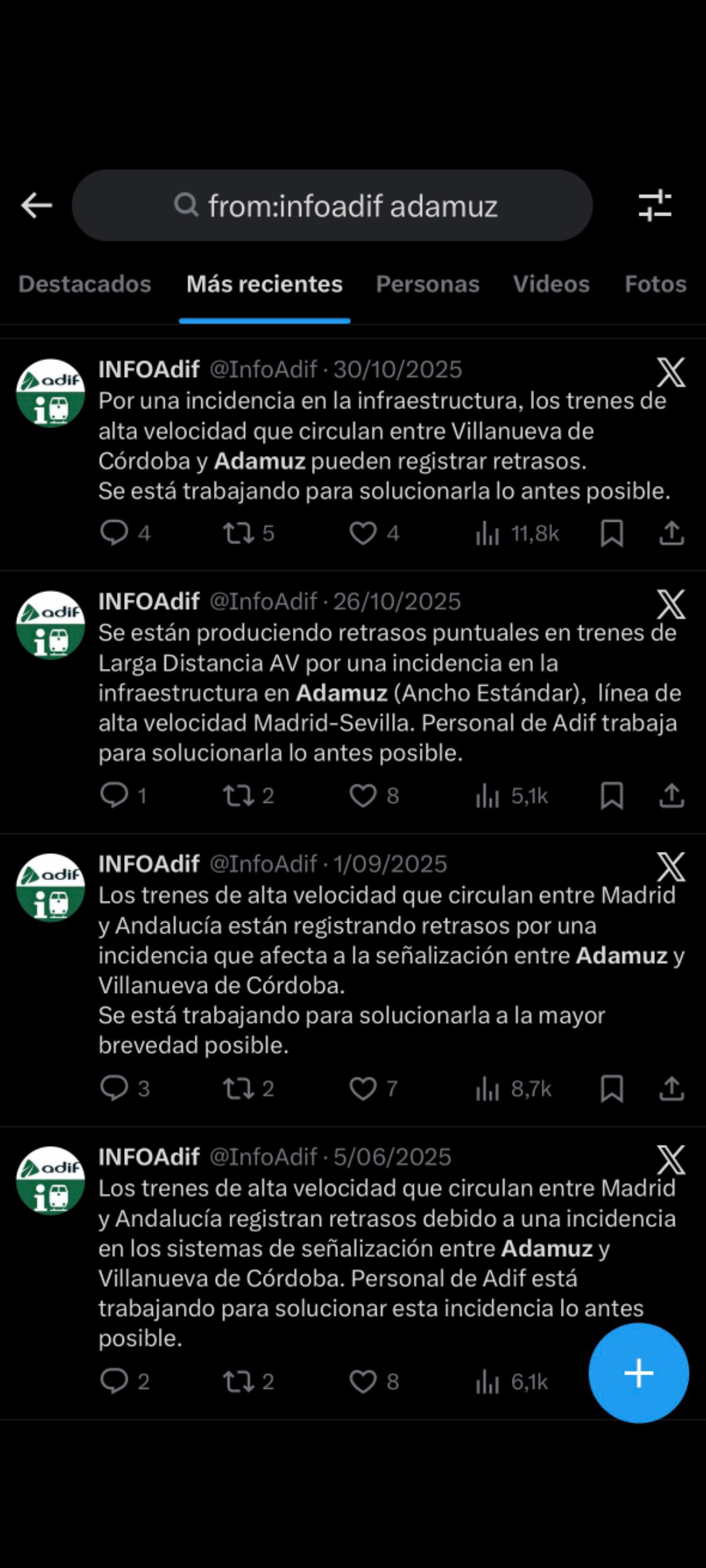 Los comunicados de InfoAdif permiten reconstruir una secuencia ininterrumpida de incidencias desde 2022 en el mismo tramo de la línea de alta velocidad Madrid–Andalucía. No es una interpretación: es un registro oficial.