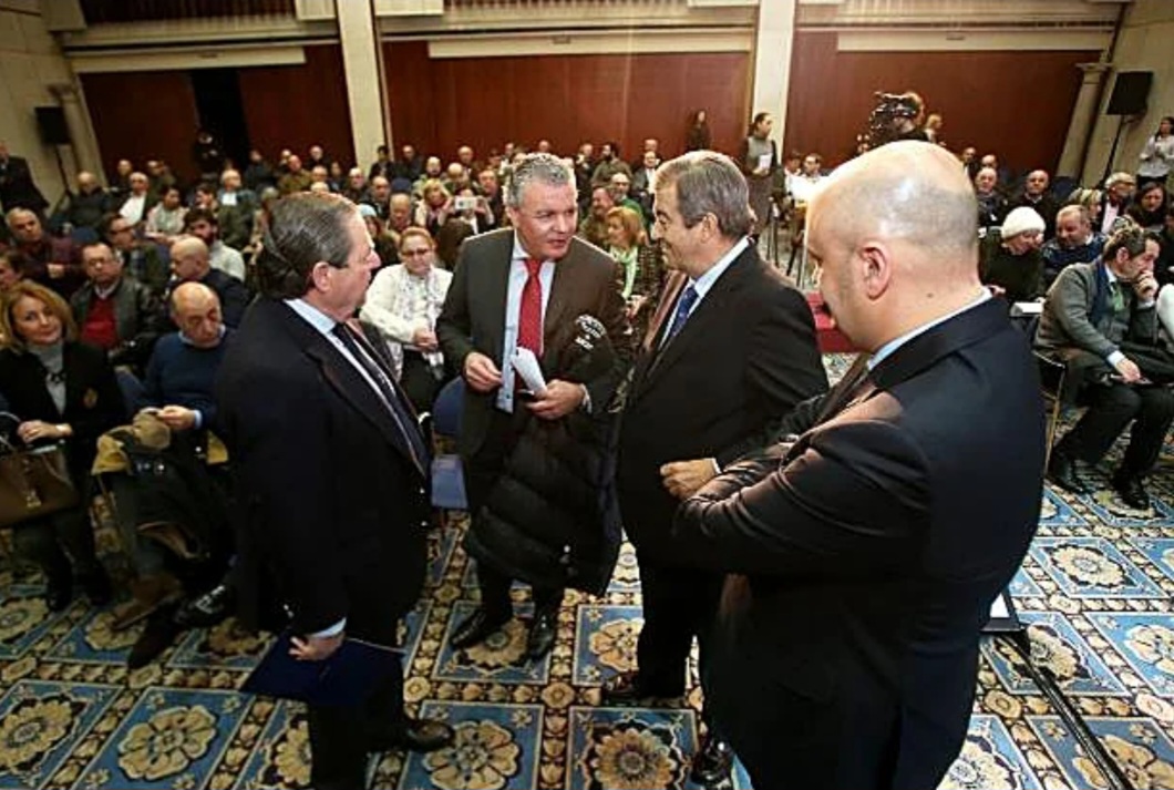 Vicente Boluda charla con Belarmino Feito (entonces presidente de Fade), Francisco Álvarez-Cascos y Pedro Leal, ante la numerosa concurrencia que acudió a escuchar su conferencia pronunciada en febrero de 2018. ÁLEX PIÑA