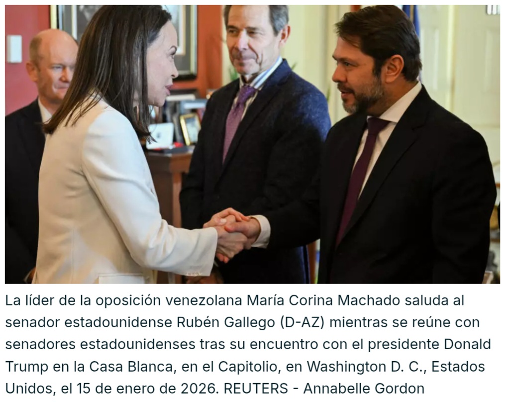 El hecho de que María Corina Machado, en pocas semanas, primero sale del clandestinaje en territorio venezolano, sobrevivió a la odisea de navegar en alta mar para llegar a Oslo, desde donde estremeció a la opinión pública y recolocó el caso Venezuela en la agenda global; luego fue recibida en el Vaticano por su santidad, León VIX, y de Roma voló a Washington en donde, el pasado lunes 15 de enero, sostuvo una reunión con Donald Trump en la Casa Blanca, seguidamente conferenció con congresistas y senadores de todas las tendencias del Parlamento estadounidense, introduce un giro relevante, positivo y cargado de significado político para la causa democrática venezolana.